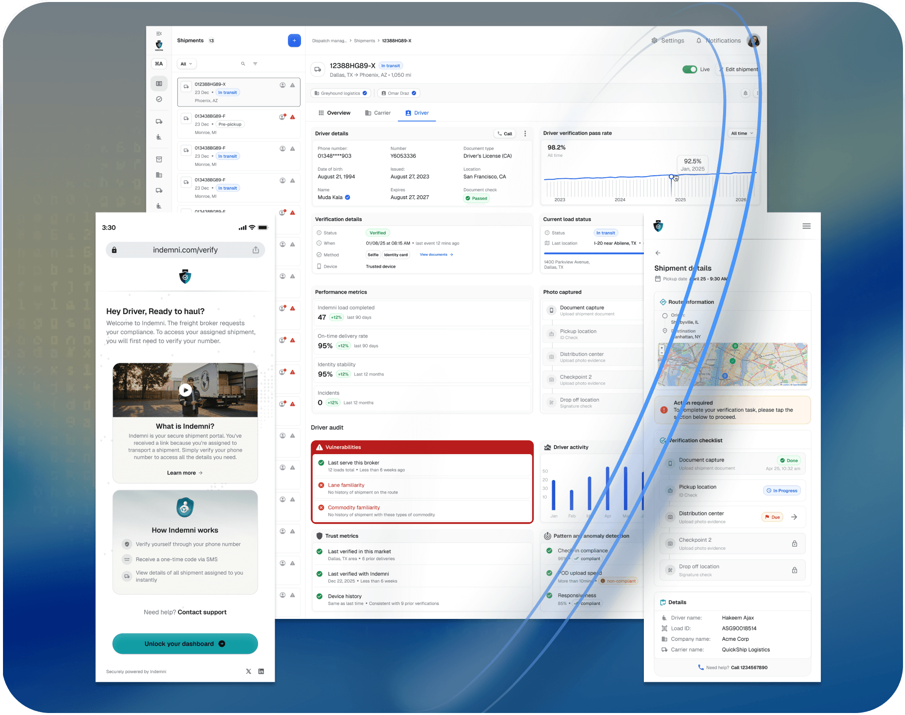 Indemni helps brokers & shippers prevent non-compliant driver assignments and avoid costly claims; so your team can stop reacting and focus on earning.