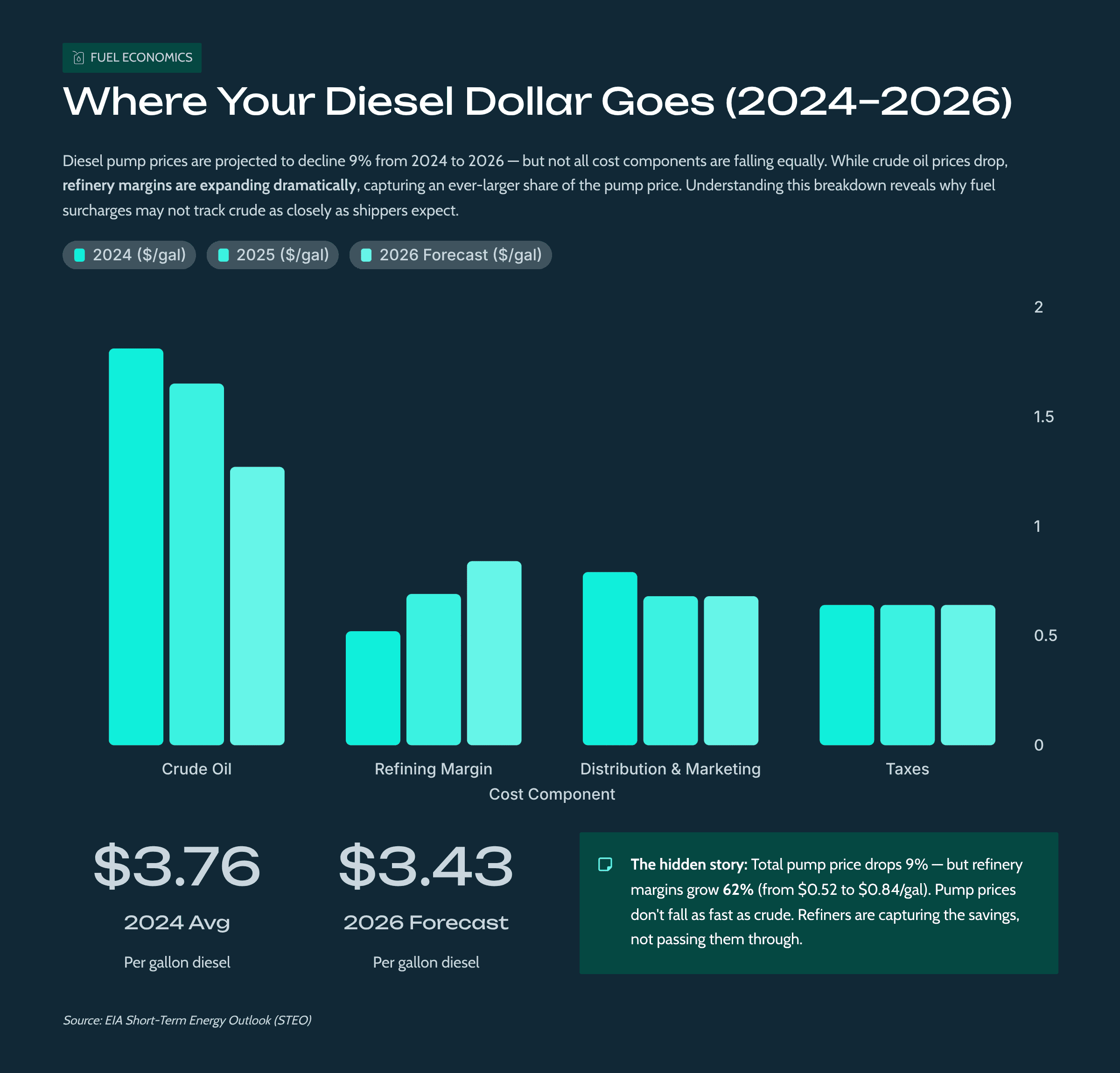Second, the gap between crude oil costs and what you pay at the pump is widening. The EIA forecasts diesel crack spreads — essentially the refinery margin — to rise from about $0.52 per gallon in 2024 to $0.84 per gallon in 2026. That means even if crude prices drop significantly, refiners are capturing more of the benefit. Retail prices don't fall as fast as crude.