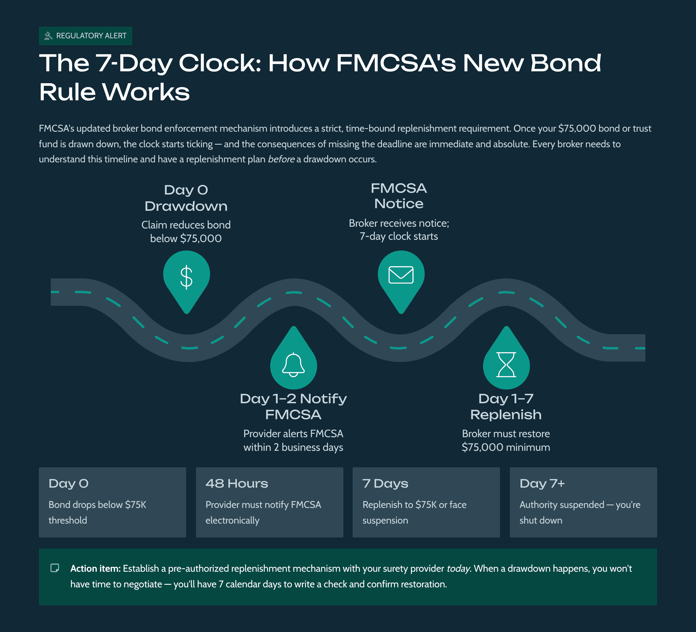 Compliance is existential. With seven days between a bond drawdown and authority suspension, there is no room for "we'll get to it." Financial responsibility, carrier verification, and fraud prevention aren't back-office functions anymore. They're front-line business continuity operations.