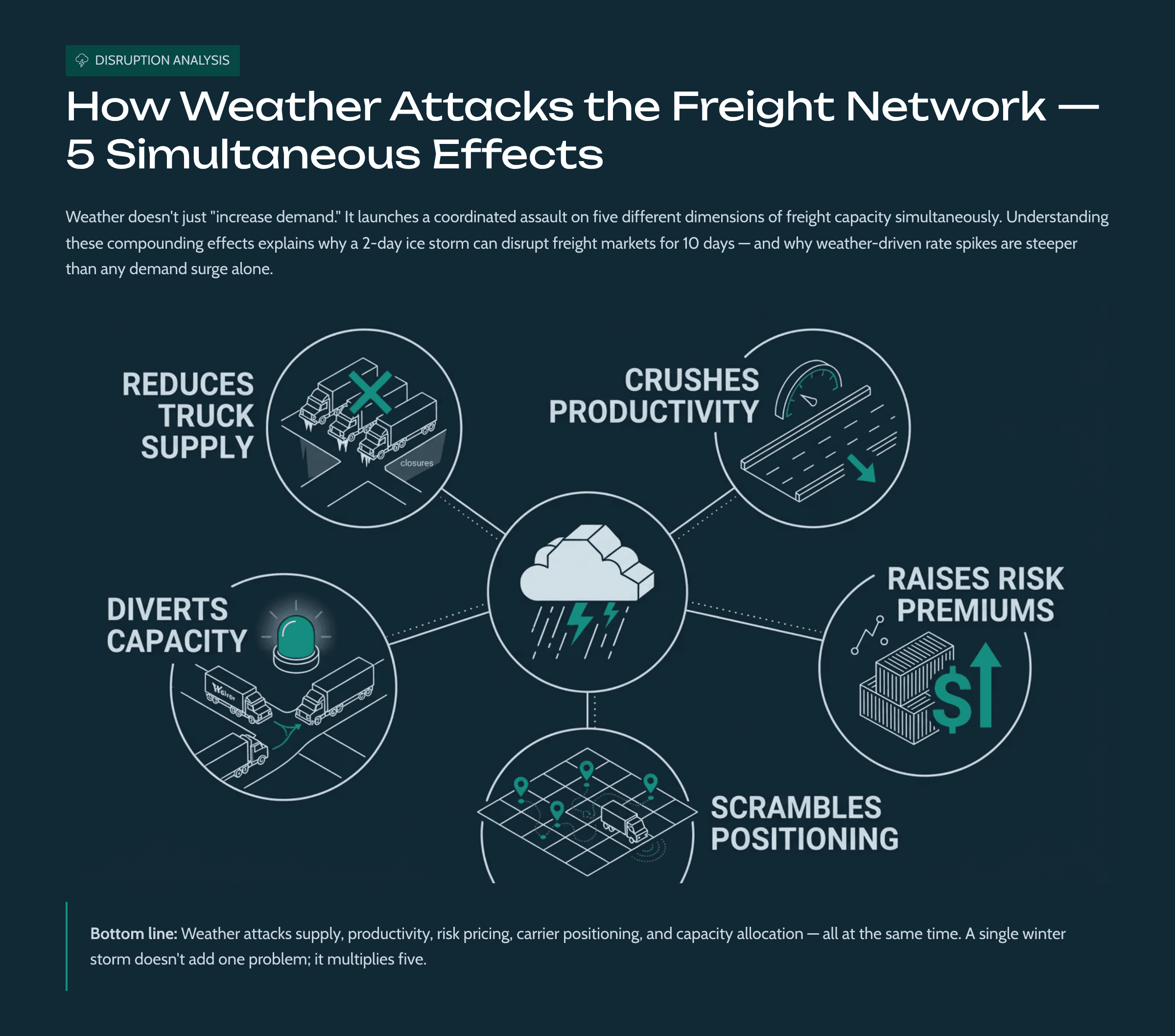 The bottom line: weather doesn't just increase demand for trucks. It reduces supply, slows the entire system, increases risk, disrupts positioning networks, and redirects capacity toward emergency freight — all at the same time. That's why weather-driven spot rate spikes can be so sharp and so fast.