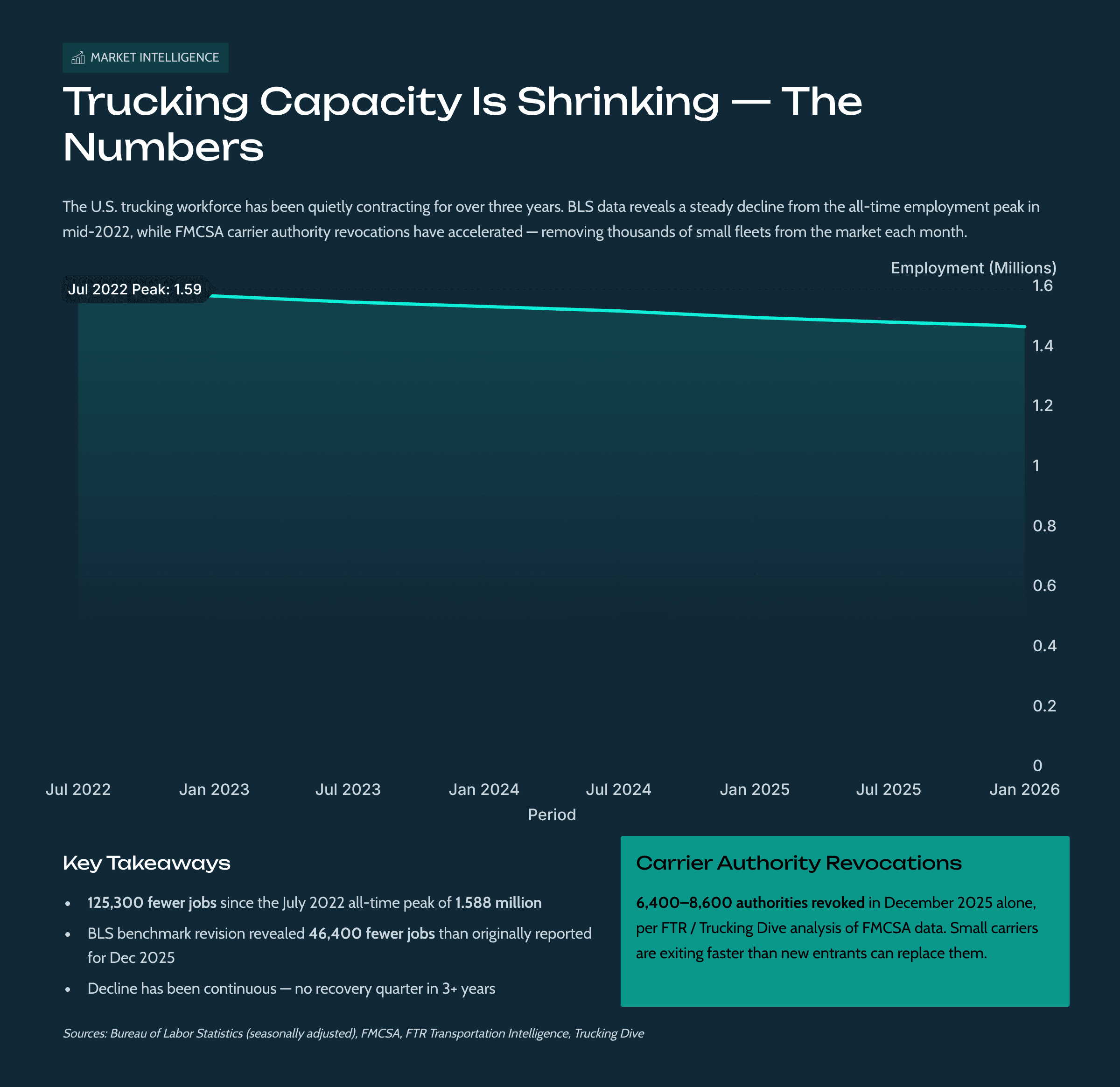On the employment side, the Bureau of Transportation Statistics reported that truck transportation employment fell to 1,462,600 in January 2026 — down 2.0% from January 2025 and down 0.3% from the previous month. That continued a trend that's been visible since mid-2023. For context, the all-time high for truck transportation jobs was 1,587,900 in July 2022. The industry has shed over 125,000 jobs from that peak.