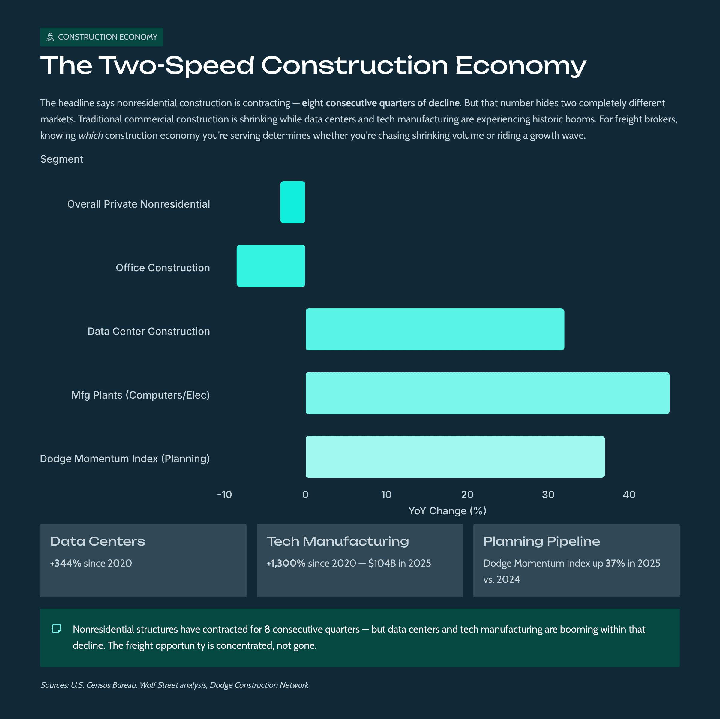 So "nonresidential construction is down" is technically true. But a freight broker who serves the data center or semiconductor supply chain is living in a completely different market than one hauling materials for traditional office or retail buildouts.