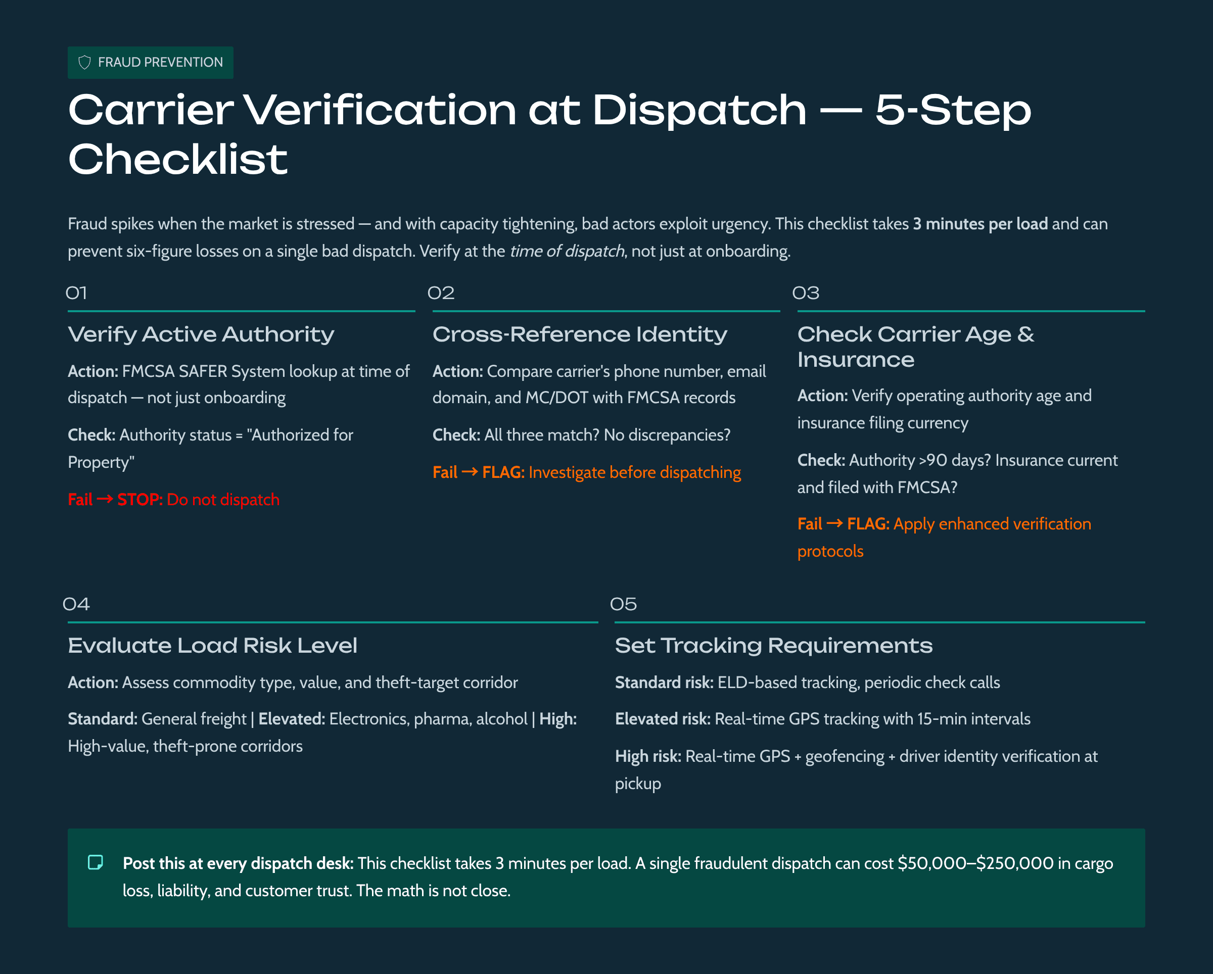When the market is stressed, freight fraud increases. Double brokering, identity fraud, and cargo theft all tend to spike when carriers are under financial pressure and when desperate brokers are scrambling for capacity.