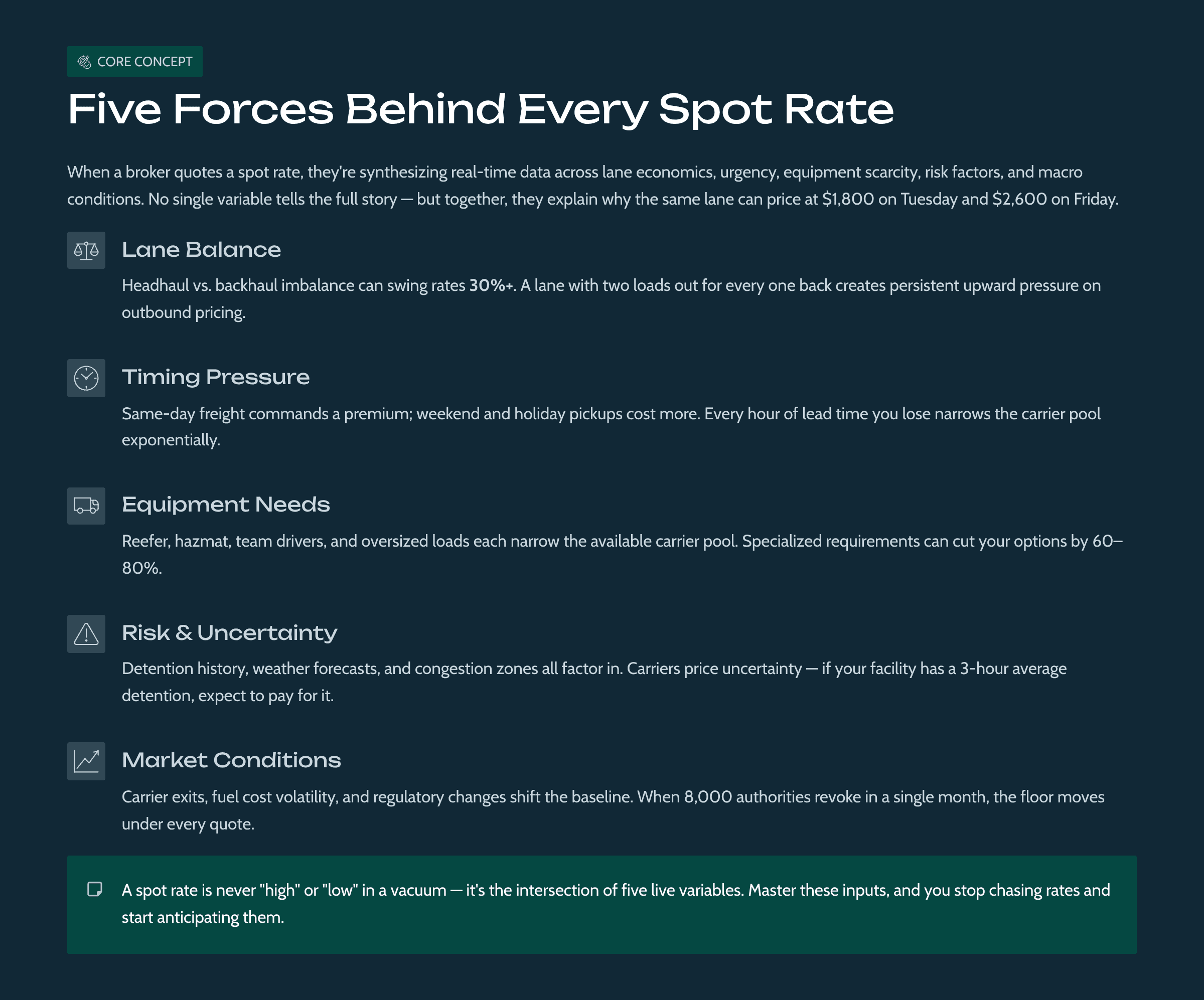 A spot rate is the price to move a specific load, right now, under today's conditions. That's it. It's not a published benchmark. It's not a national average. It's the number that a broker and a carrier agree on for one load, one lane, one pickup window — today.