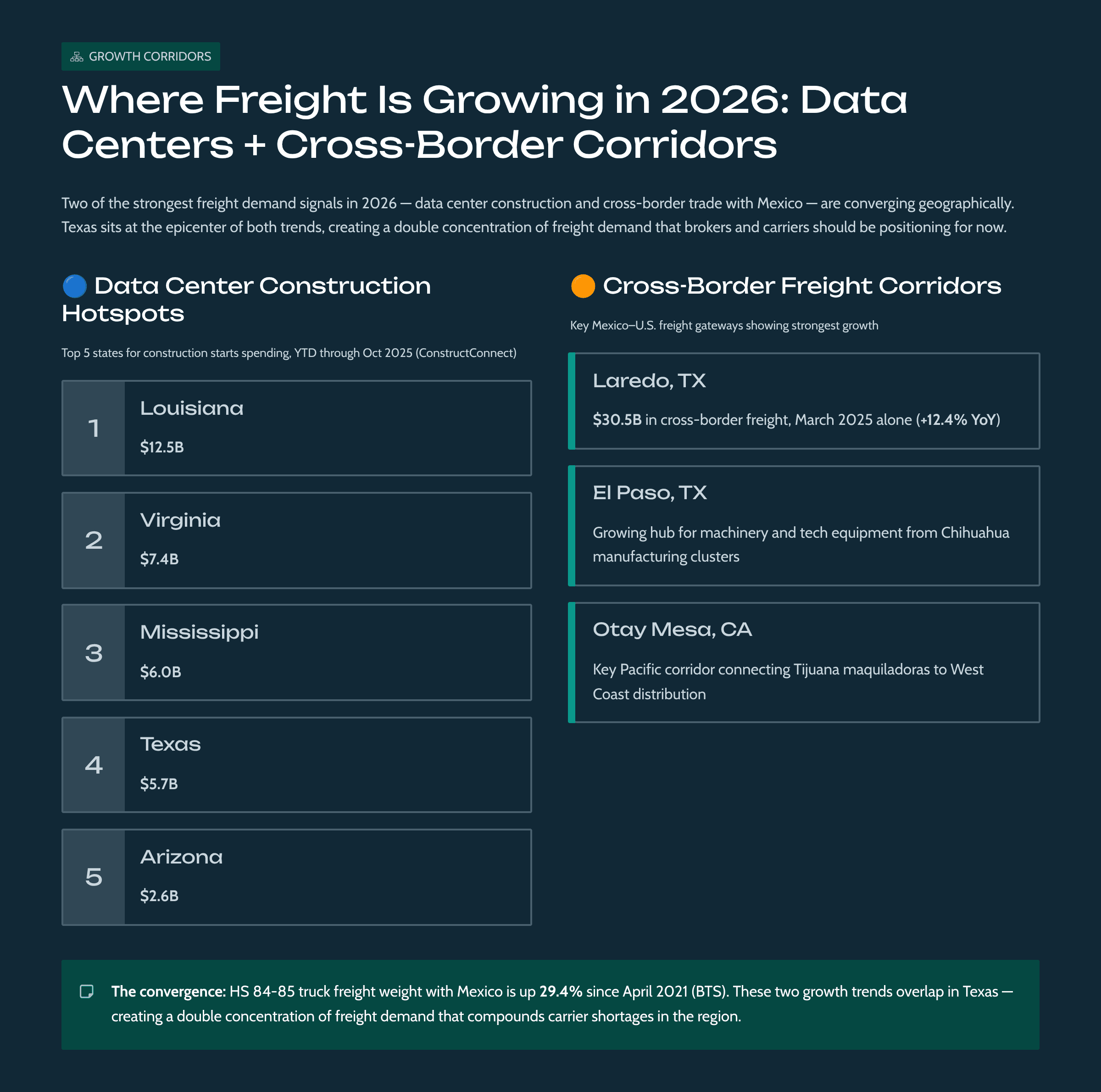 Go where the freight is growing. National averages are noise. The signal is in the corridors: data center buildouts, cross-border Mexico, AI-driven manufacturing. Position your brokerage on those lanes and build the operational muscle to serve them.