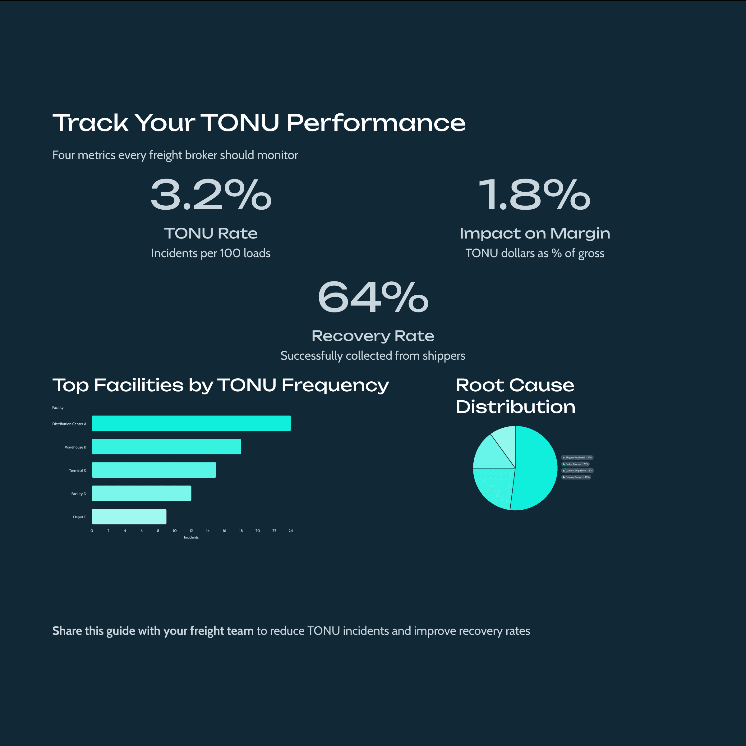 Recovery rate from shippers — the percentage of TONU charges you successfully collect from customers. If this number is low, your shipper agreements need work.