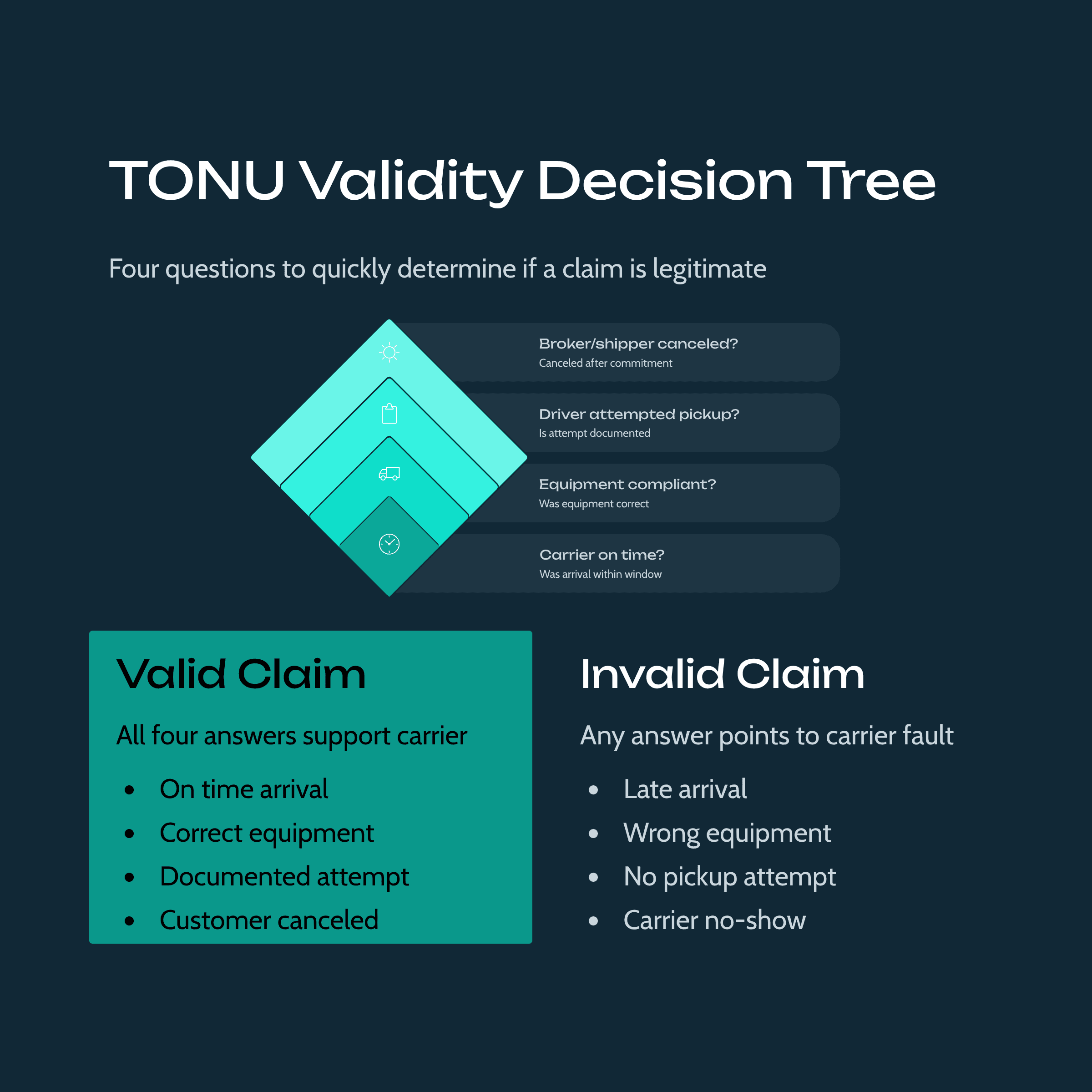 Before you dig into any TONU claim, answer these four questions. Was the carrier on time relative to the pickup window? Was the equipment compliant with what was booked? Did the driver actually attempt pickup, based on location and time evidence? Did the broker or shipper cancel after the carrier was committed?