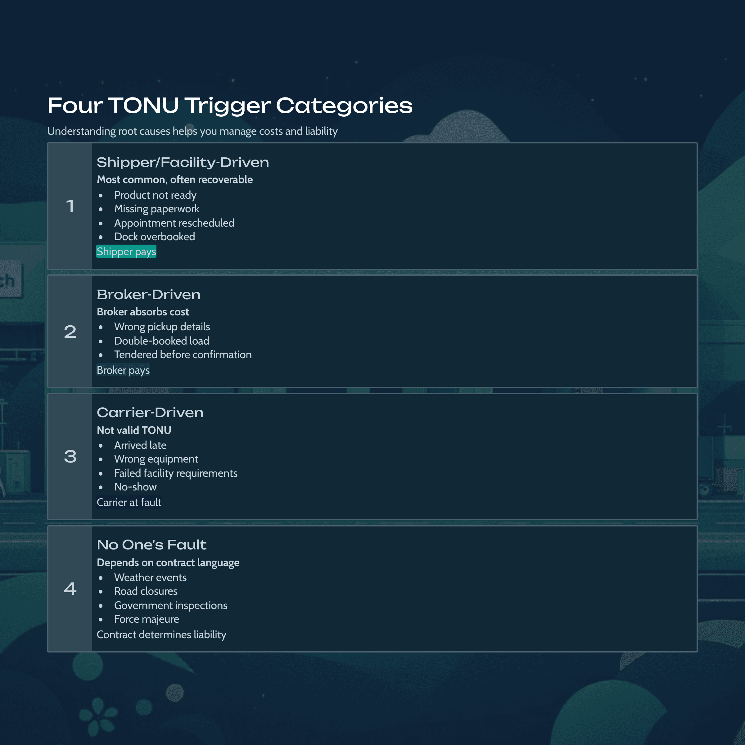 TONU is not a blanket entitlement on every cancellation. It's not a substitute for detention (which applies when the load still moves) or layover (which applies when the truck holds overnight). And it's not a weapon a carrier can use just because a load fell through. TONU hinges on three things: timing, fault, and proof. Without all three, the claim doesn't hold.