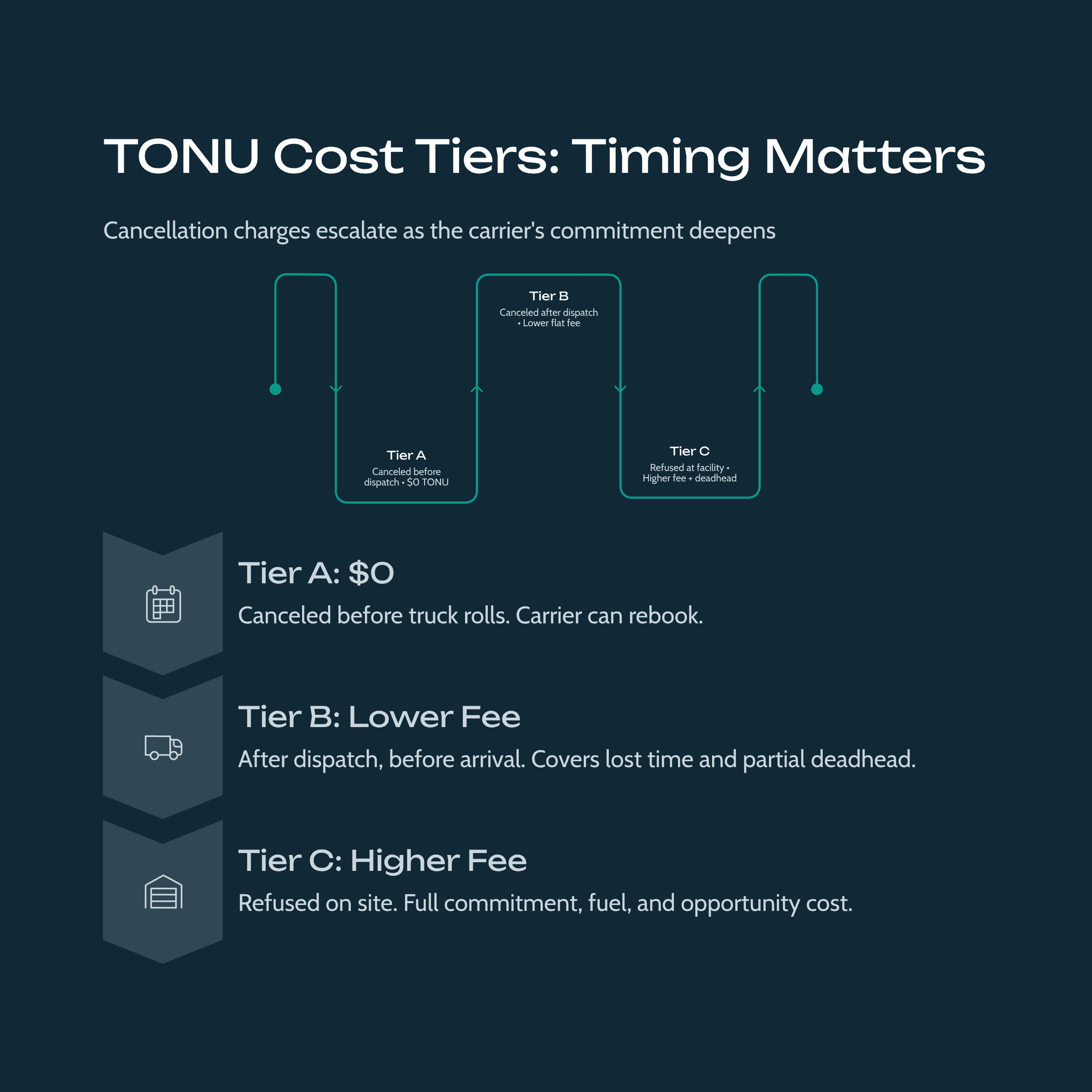 Tier B: Canceled after dispatch but before the truck arrives at the facility. Typical TONU: a lower flat fee that acknowledges the lost time and partial deadhead.
